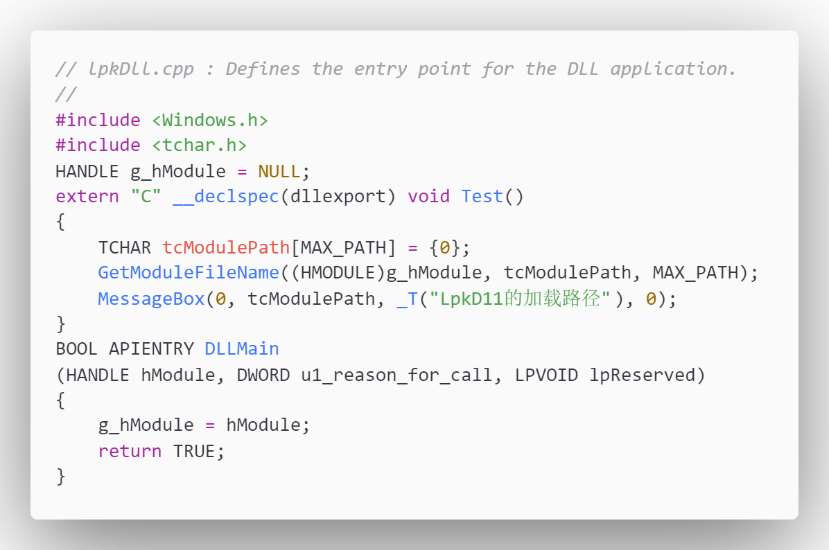 MessageBox(0, tcModulePath, _T("LpkD11的加载路径"), 0);