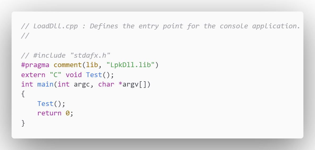 第二段LoadDll:是一个控制台程序,链接创建的动态链接库LpkDll。