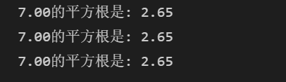 from math import sqrt n = float(input('输入一个数:')) ans1 = sqrt(n) ans2 = n**0.5 print('%.2f的平方根是: %.2f' %(n, ans1)) print('{:.2f}的平方根是: {:.2f}'.format(n, ans2)) print(f'{n:.2f}的平方根是: {ans2:.2f}')