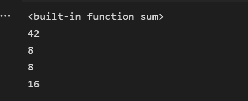 print(sum) sum = 42 print(sum) def inc(n): sum = n+1 print(sum) return sum sum = inc(7) + inc(7) print(sum)