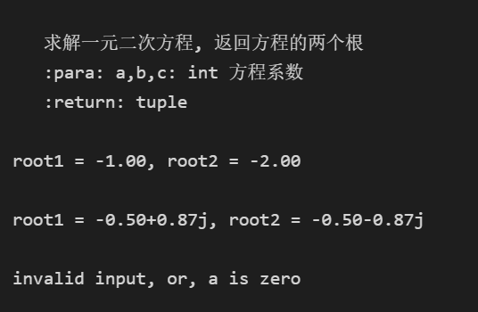 def solve(a, b, c): ''' 求解一元二次方程, 返回方程的两个根 :para: a,b,c: int 方程系数 :return: tuple ''' delta = b*b - 4*a*c delta_sqrt = abs(delta)**0.5 p1 = -b/2/a; p2 = delta_sqrt/2/a if delta>=0: root1 = p1 + p2 root2 = p1 - p2 else: root1 = complex(p1, p2) root2 = complex(p1, -p2) return root1, root2 print(solve.__doc__) while True: try: a,b,c = eval(input('Enter eqution coefficient: ')) if a == 0: raise except: print('invalid input, or, a is zero') break else: root1, root2 = solve(a, b, c) print(f'root1 = {root1:.2f}, root2 = {root2:.2f}') print()
