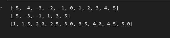 def list_generator(begin, end, step=1): ls = [] a = begin b = end while a <= b: ls.append(a) a += step return ls list1 = list_generator(-5, 5) print(list1) list2 = list_generator(-5, 5, 2) print(list2) list3 = list_generator(1, 5, 0.5) print(list3)