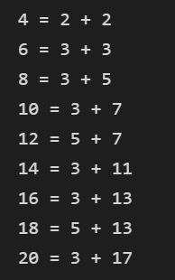 def is_prime(a): for i in range(2, int(a)+1): if not n%i: return False else: return True ls = [] for i in range(20): if is_prime(i): ls.append(i) def summary(x): i = 0 while True: for j in range(i, len(ls)): s = ls[i]+ls[j] if x == s: s = f"{s} = {ls[i]} + {ls[j]}" return s i += 1 for i in range(4, 21, 2): print(summary(i))