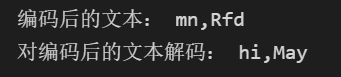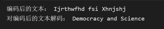 def encoder(a): """对文本加密""" result = '' for i in range(len(a)): if ord(a[i]) in range(65, 91): result+=chr((ord(a[i])-65+5)%26+65) elif ord(a[i]) in range(97, 123): result+=chr((ord(a[i])-97+5)%26+97) else: result += a[i] return result def decoder(a): """解码加密文本""" result = '' for i in range(len(a)): if ord(a[i]) in range(65, 91): result+=chr((ord(a[i])-65+26-5)%26+65) elif ord(a[i]) in range(97, 123): result+=chr((ord(a[i])-97+26-5)%26+97) else: result += a[i] return result text = input("输入英文文本: ") print(f"编码后的文本: {encoder(text)}") print(f"对编码后的文本解码: {decoder(encoder(text))}")