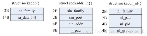 struct sockaddr_ln为Netlink的地址,和我们通常socket编程中的sockaddr_in作用一样,他们的结构对比如下:
