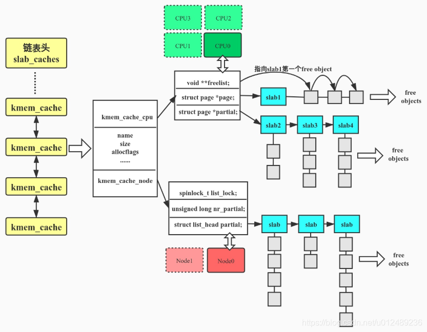 freelist 指向本地CPU的第一个空闲对象,这一项会有指针指向下一个空闲的项,最终所有空闲的项会形成一个链表