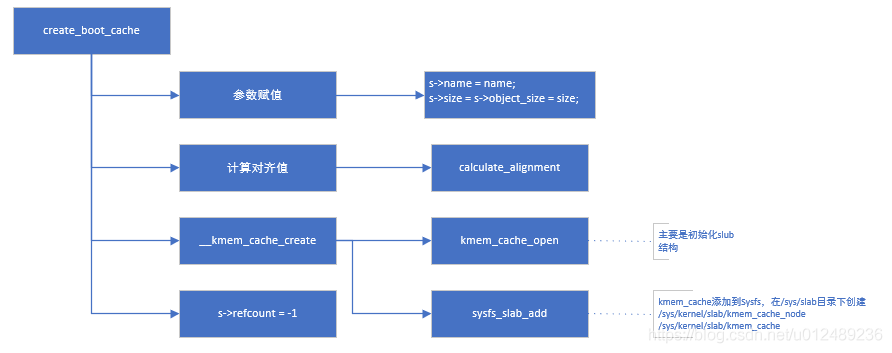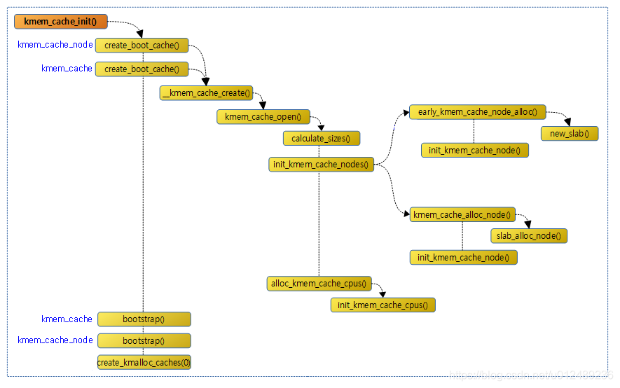它在内核初始化阶段(start_kernel)、伙伴系统启用之后调用,它首先执行缓存初始化过程,如下图所示