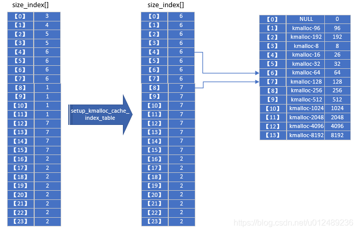 接下来是创建kmalloc boot cache - create_kmalloc_caches(),来初始化kmalloc_caches表,其最终创建的kmalloc_caches是以{0,96,192,8,16,32,64,128,256,512,1024,2046,4096,8196}为大小的slab表;创建完之后,将设置slab_state为UP,然后将kmem_cache的name成员进行初始化;最后如果配置了CONFIG_ZONE_DMA,将会初始化创建kmalloc_dma_caches表。可以得到size_index与kmalloc_caches的对应关系