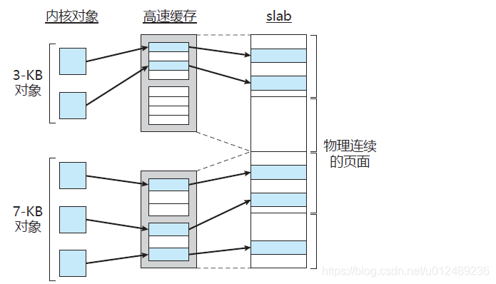 上图显示了slab、cache及object 三者之间的关系。该图显示了2个大小为3KB 的内核对象和3个大小为7KB的对象,它们位于各自的cache中。slab分配算法采用 cache来存储内核对象。在创建 cache 时,若干起初标记为free的对象被分配到 cache。cache内的对象数量取决于相关slab的大小。例如,12KB slab(由3个连续的4KB页面组成)可以存储6个2KB对象。最初,cache内的所有对象都标记为空闲。当需要内核数据结构的新对象时,分配器可以从cache上分配任何空闲对象以便满足请求。从cache上分配的对象标记为used(使用)。