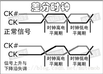 图上可以清楚的看到,DDR SDRAM可在一个时钟周期内传送两次数据,上升沿传一次,下降沿传一次。