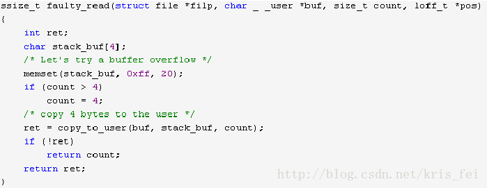 例子中由于字符串的长度长处了数组范围,当函数返回时就会导致缓冲区溢出错误而引起oops。像这样的exception就比较难追踪。