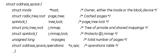 这个原理和CPU中的硬件cache有点像,不过硬件cache是CPU缓存内存的数据。因为内存有限我们不能缓存全部数据,只需要把调用的内容缓存起来就可以了,这种方式叫做demand paging(按需取页)。在page cache中缓存了很多的页,怎么查找和管理呢?这时候就要关注一下address_space结构体,一个address_space管理了一个文件在内存中缓存的所有pages,这部分缓存也是页高速缓存。这个address_space可不是进程虚拟地址空间的address space,但是两者之间也是有很多联系的。mmap映射会将文件的一部分内容映射到虚拟地址空间的VMA,如果有5个进程,每个进程mmap同一个文件两次(文件的不同部分),就会有10个VMA,但address_space只有一个,虚拟空间的VMA使用的是rbtree,下面会介绍到为什么不在rbtree上去做xarray。在inode的结构体中会有一个i_mapping指向这个结构体。下面看下这个结构体的内容: