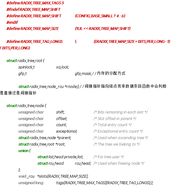 Tags是一个二维数组,RADIX_TREE_MAX_TAGS为3代表的是3种tag类型,RADIX_TREE_TAG_LONGS定义slot数占用的long类型长度个数。加入这个值为64,也就是3*64的数组,这样每一行代表一种tag的集合,假如tag[0]代表PAGE_CACHE_DIRTY,假如我们查到当前节点的tags[0]值为1,那么它的子树节点就存在PAGE_CACHE_DIRTY节点,在我们查找PG_dirty的页面时,就不用遍历整个树了,可以提高查找效率。Radix树提供了一些关于tag的操作函数。这个大家可以去内核的/lib/radix-tree.c官网上去查看源码。这里就不细讲了。