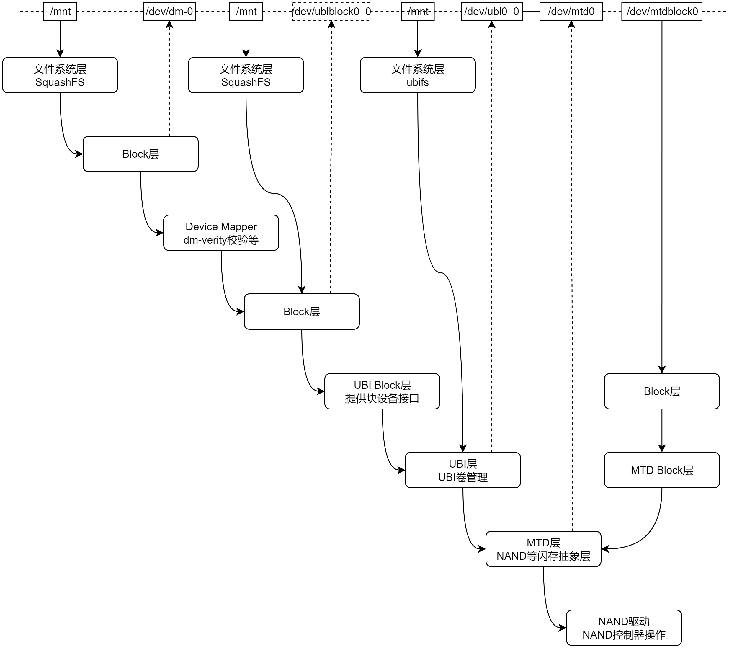 Device Mapper(dm-verity):截获请求,验证数据块的哈希值(若使用 dm-verity)。通过哈希树校验数据完整性,校验通过后将请求转发到 `/dev/ubiblock0_0`。