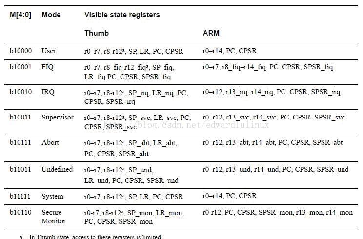 每一种模式对应不同的bank register。中文官方翻译不详。但是每一种模式要拥有自己独立的寄存器组。并且每一种模式使用和可见寄存器的数量也是不相同的。