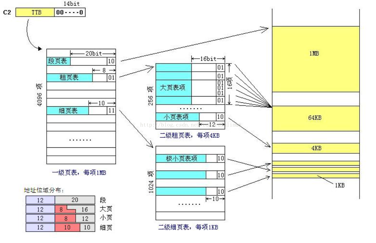 Arm上的linux(正式)页表采用的是一级粗页表结合二级小页表实现4G空间的访问。如上图说明。