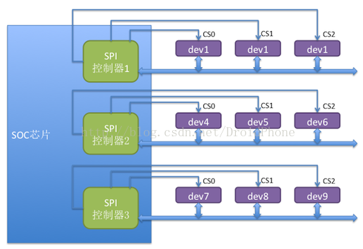 如上图所示,主设备对应SOC芯片中的SPI控制器,通常,一个SOC中可能存在多个SPI控制器,像上面的例子所示,SOC芯片中有3个SPI控制器。每个控制器下可以连接多个SPI从设备,每个从设备有各自独立的CS引脚。每个从设备共享另外3个信号引脚:SCK、MISO、MOSI。任何时刻,只有一个CS引脚处于有效状态,与该有效CS引脚连接的设备此时可以与主设备(SPI控制器)通信,其它的从设备处于等待状态,并且它们的3个引脚必须处于高阻状态。