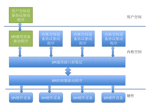在内核的SPI驱动的软件架构中,进行了合理的分层和抽象,如下图所示: