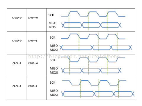 按照时钟信号和数据信号之间的相位关系,SPI有4种工作时序模式: