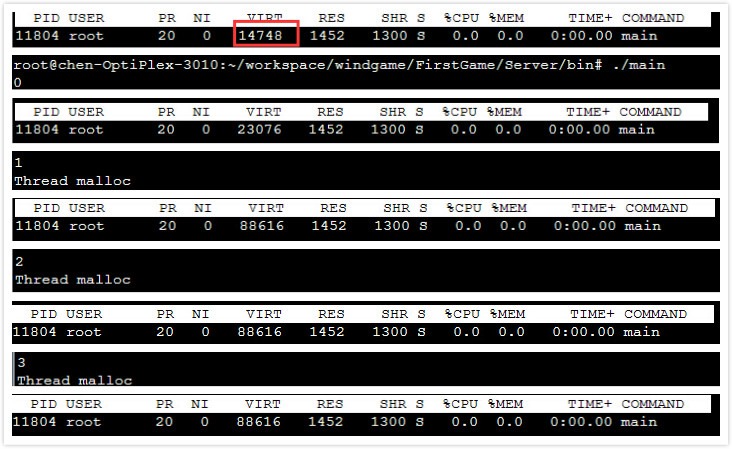 其运行结果如下图,刚开始时,进程占用虚拟内存14M,输入0,创建子线程,进程内存达到23M,这增加的10M是线程堆栈的大小(查看和设置线程堆栈大小可用ulimit –s),第一次输入1,程序分配1k内存,整个进程增加64M虚拟内存,之后再输入2,3,各再次分配1k,内存均不再变化。