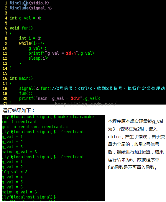 为了防止这种情况的发生,可以将g_val改为局部变量。这样函数两次被调用的时候,两次结果最终并不影响且相等,函数变为可重入函数了。