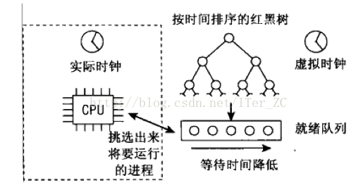 Linux的调度器和传统基于时间片的调度器有所差别,它考虑的是进程的等待时间,即全部可执行的进程在一个就绪队列里面等待的时间。对CPU时间要求最严格的进程被挑选执行。就绪队列中的进程被组织成一棵红黑树来加速操作。等待最长的进程在最左边。