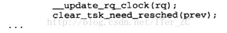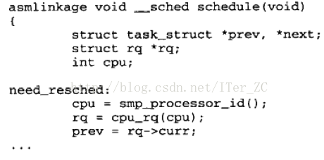 1.schedule函数首先确定当前就绪队列,并在prev指针保存当前还在执行的进程task_struct。改动就绪队列的clock值,取消TIF_NEED_RESCHED标志。