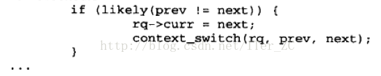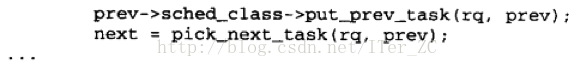 3. 调用调度器类的put_prev_task通知调度器类当前进程要被还有一个进程所替换。调用pick_next_task选取下一个进程。不一定会选取新的进程,比方其它进程都处于睡眠状态,就一个能够执行的进程。一旦选择了一个进程,那么就要准备执行硬件级的上下文切换