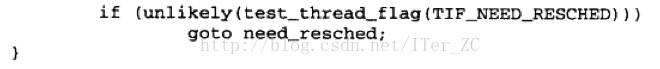 假设当前进程须要被又一次调度,那么调度器类会在task_struct中设置TIF_NEED_RESCHED标志,内核会在适当的时机完毕该调度请求。