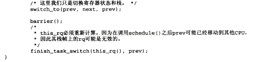 主调度器负责把CPU从一个进程交给还有一个进程。主调度器在schedule函数中实现。当系统调用返回时,内核会检查当前进程是否设置了重调度标志TIF_NEED_RESCHED。假设设置了该标志,那么内核会调用schedule函数来切换。