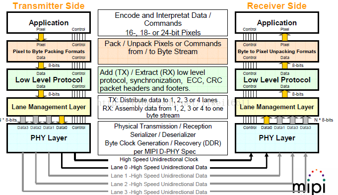 根据应用模块的需要,在发送端对发送的命令和数据进行初步编码转化为MIPI-DSI所规定的格式,而在接收端则将接收的数据还原为应用模块所支持的数据格式及时序要求。
