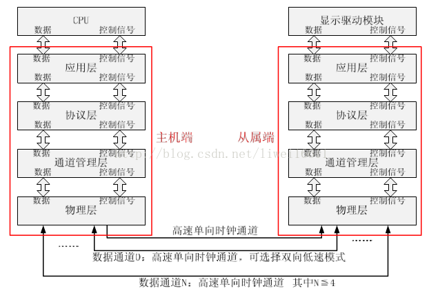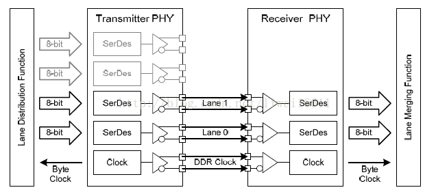 按照D-PHY协议,在整个协议的物理层中,在主机端和从属端之间采用的是同步连接,时钟通道用于传送高速时钟,一个或多个数据通道用于传送低功耗数据信号或高速数据信号每一个通道都是利用两根互连线实现主机端和从属端的连接,并且支持高速模式和低速ESCAPE模式。