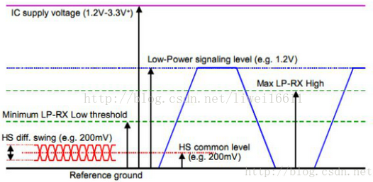 低速模式LP:0-1.2V,空闲电平(LP11)Dp,Dn是1.2V。