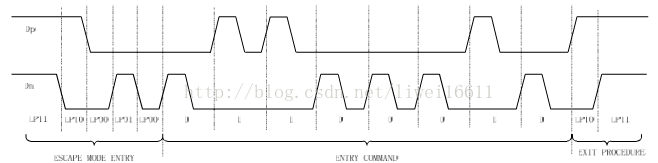 ESCAPE模式是由LP_TX直接驱动线路通道发送电平序列传送低功耗数据。其进入方式为LP11->LP10->LP00->LP01->LP00,退出方式为LP10->LP11。经过请求序列之后,LP_TX发送模式命令,包括trigger命令和低功耗数据传送(LPDT)等,如下如所示: