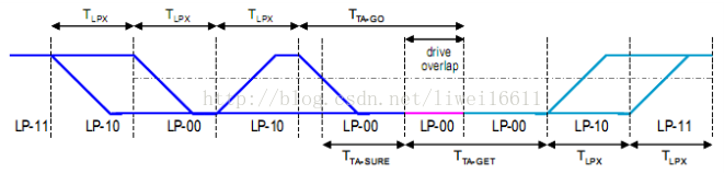 BTA模式用于交换总线控制权,在控制模式下完成。LP_TX发送请求序列LP11->LP10->LP00->LP10->LP00,经过BTA-GO之后停止驱动总线。相对于总线另一端来说,在接收到请求序列并且经过BTA-SURE之后,LP_TX开始驱动总线,发送确认信号,接管总线。