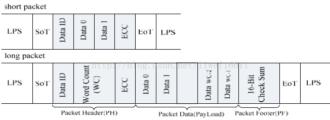 和长数据包(long packet),短数据包主要用于传输命令、读写寄存器,长数据包主要用用于传输大量图象数据或部分控制命令。