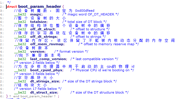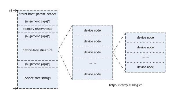 U-Boot需要将设备树在内存中的存储地址传给内核。该树主要由三大部分组成:头(Header)、结构块(Structure block)、字符串块(Strings block)。