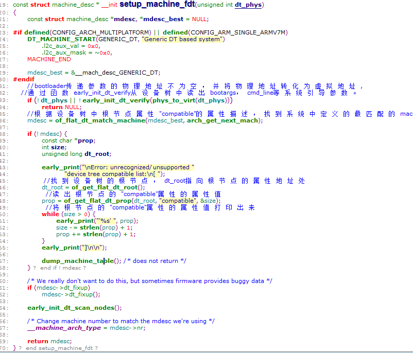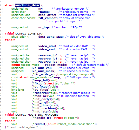 内核提供了一个重要的结构体struct machine_desc ,这个结构体在内核移植中起到相当重要的作用,内核通过machine_desc结构体来控制系统体系架构相关部分的初始化。machine_desc结构体通过MACHINE_START宏来初始化,在代码中, 通过在mian->setup_arch中调用setup_machine_fdt来获取。