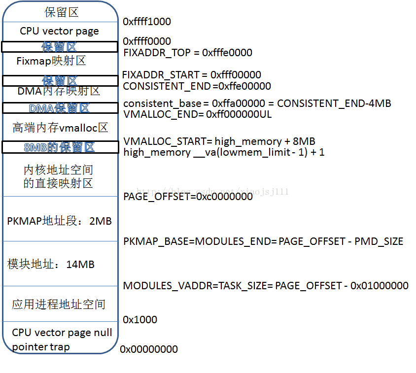 另外vmalloc区域跟高端内核(high_memory)有一个8MB的保留区域。端内存的物理地址与线性地址之间的转换不能使用上面的__pa(x)和__va(x)宏,关于该区域linux内核的文档:arm/memmory.txt有如下的描述: