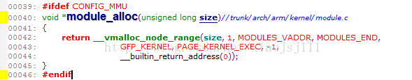 line42可见:就指定了模块的虚拟地址范围为:[MODULES_VADDR,MODULES_END] = [0xbf000000,0xbfe00000],总计14MB。注意此时__vmalloc_node_range进行了实际的物理内存分配,并且建立了物理到虚拟地址的映射。