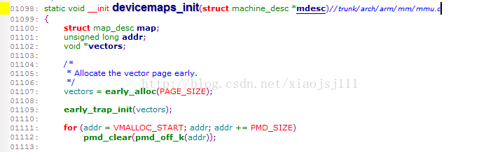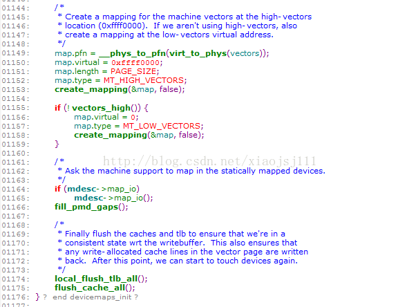 line1149-1153:将line1107行分配的物理页映射到虚拟地址0xffff0000,为cpu中断产生时,做好准备(对应的地址有各自的跳转代码,来处理各自的中断异常)。在这里这个物理页同样是存在两个虚拟地址的映射,一个是低端虚拟地址的影射,一个是高端虚拟地址的映射