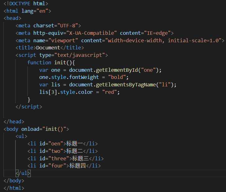 此代码中通过访问id名为one的元素,对元素中的字体进行加粗。通过访问通过标签名的方式来获取所有的<li>