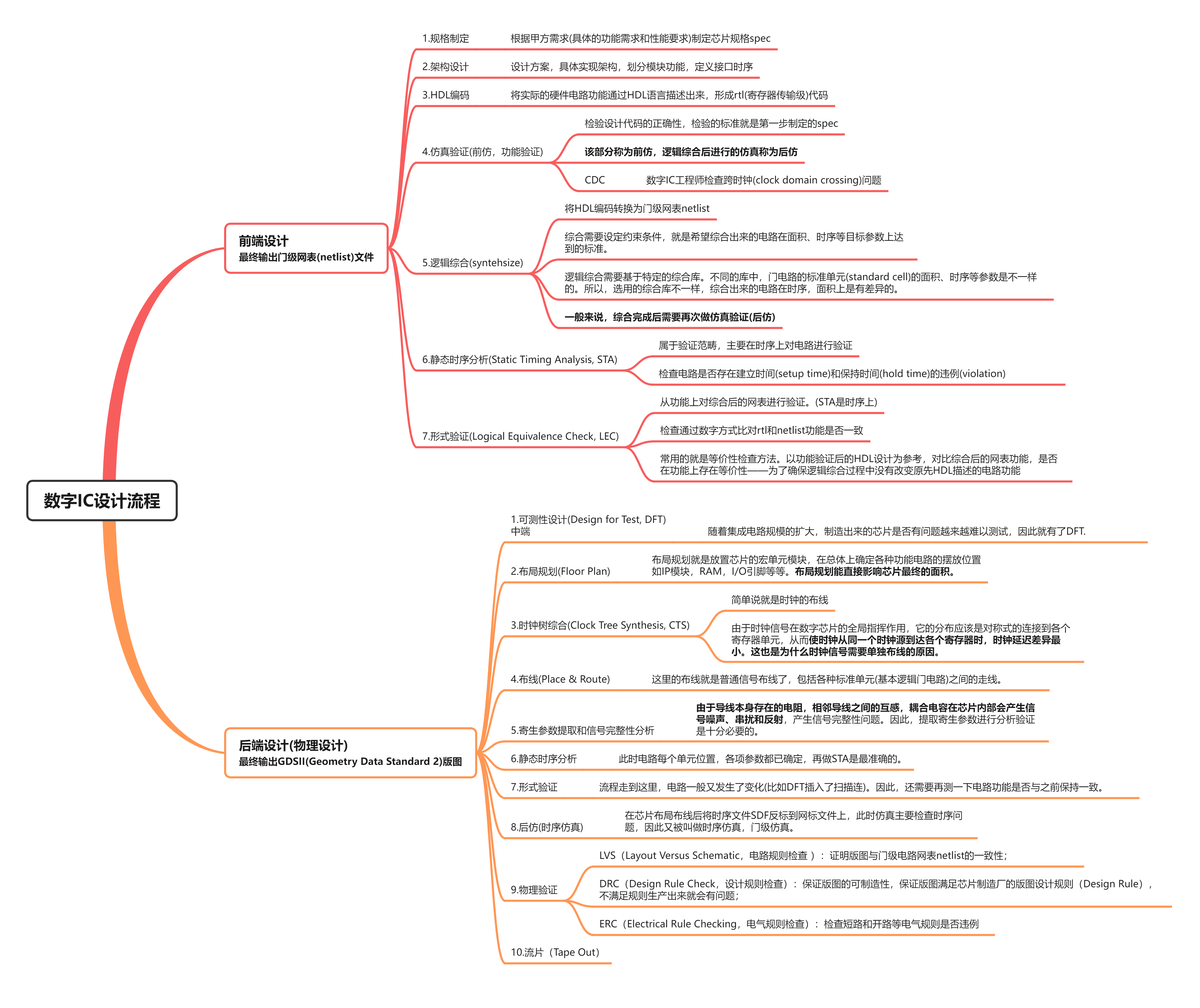 - 会用到synthesis(逻辑综合),formality(形式验证,就是说rtl转为netlist之后,如何保证netlist功能和rtl功能是一致的),STA(静态时序分析,验证门级逻辑网络结构netlist的时序是否正确),DFT等技术