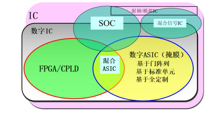 IC设计可以粗分为数字IC设计和射频/模拟IC设计;数字IC设计又可分为ASIC设计和FPGA/CPLD设计;此外还有一部分IC设计采用数模混合设计,如:SOC设计和数模混合信号IC设计。