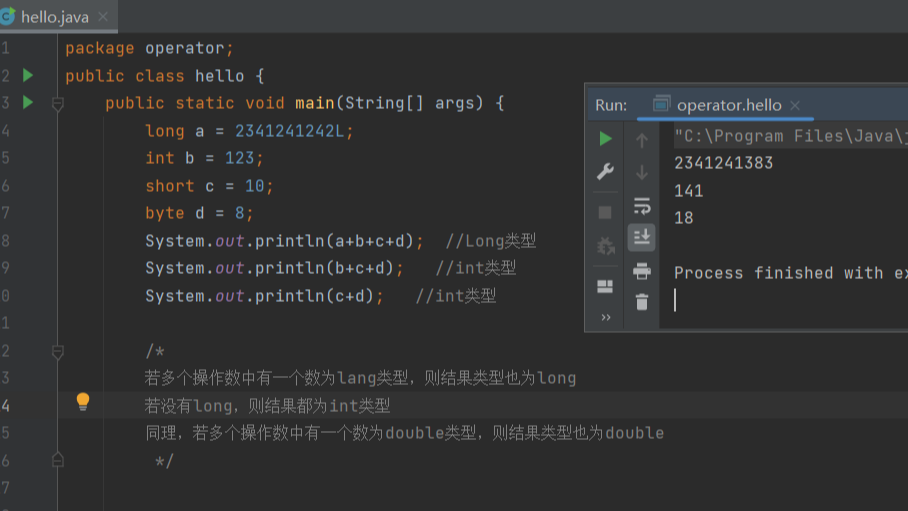 //偷懒的 int a = 10; int b = 20; a+=b; //a = a+b 输出30 a-=b; //a = a-b 输出-10 System.out.println(a);//字符串连接符 + string int a = 10; int b = 20; System.out.println(""+a+b); //输出1020 /* 在加号运算符两侧,只要有一侧出现string类型(字符串类型),则会把其他操作数都转换为string,在进行连接. */ System.out.println(a+b+""); //输出30 /* 若字符串在后面,则前面依旧进行运算 */
