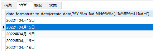 date_format(str_to_date(create_date,'%Y-%m-%d %H:%i:%s'),'%Y年%m月%d日') date,