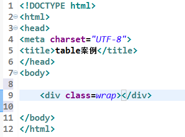 首先,我们要在body区域弄出个空间来,专门存放这个table。之前我们都是直接在body上面弄的,而事实上,在实际开发中是不会这么做的。好的,我们来一个div元素,加一个class叫做wrap,wrap表示包裹,我们需要一个div来包裹table。