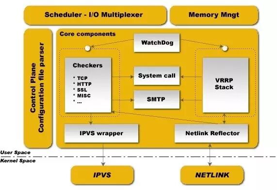 由图可知,两个子进程都被系统WatchDog看管,两个子进程各自负责自己的事,healthchecker子进程负责检查各自服务器的健康程度,例如HTTP,LVS等等,如果healthchecker子进程检查到MASTER上服务不可用了,就会通知本机上的VRRP子进程,让他删除通告,并且去掉虚拟IP,转换为BACKUP状态。