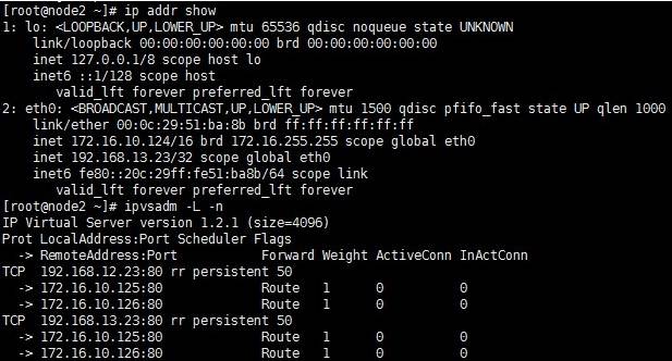由此可见,一个主节点挂掉以后所有的VIP和ipvs规则都会转移到另一个节点,所以访问也不会受到任何影响,这里就不再测试。如果故障节点重新上线,资源还会再次回到工作节点。