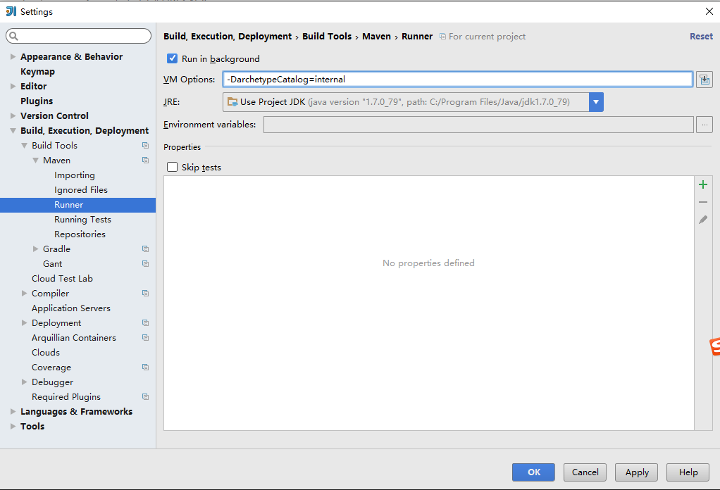 在maven的VM Options加上-DarchetypeCatalog=internal参数,如下: